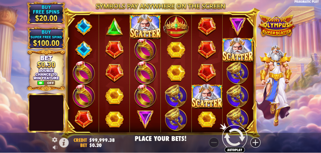 《Gates of Olympus Super Scatter》是一款神话主题的高波动老虎机,由知名游戏开发商Pragmatic Play推出,是《Gates of Olympus》系列的升级版本。游戏以希腊众神之王宙斯为主角,玩家将穿越奥林匹斯山,解锁隐藏在神殿中的超级Scatter奖金与连锁赢奖机会。