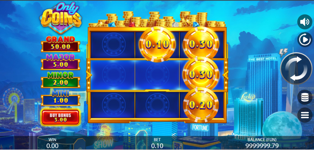 《Only Coins Slot》是一款由专注于极简机制与高奖励设计的厂商Spinomenal推出的老虎机游戏。本作主打极致精简的玩法结构,去除传统图标与复杂机制,仅围绕“金币”展开,带来直击主题的纯粹刺激体验。对于追求快速节奏与高爆发潜力的玩家来说,这款游戏极具吸引力。